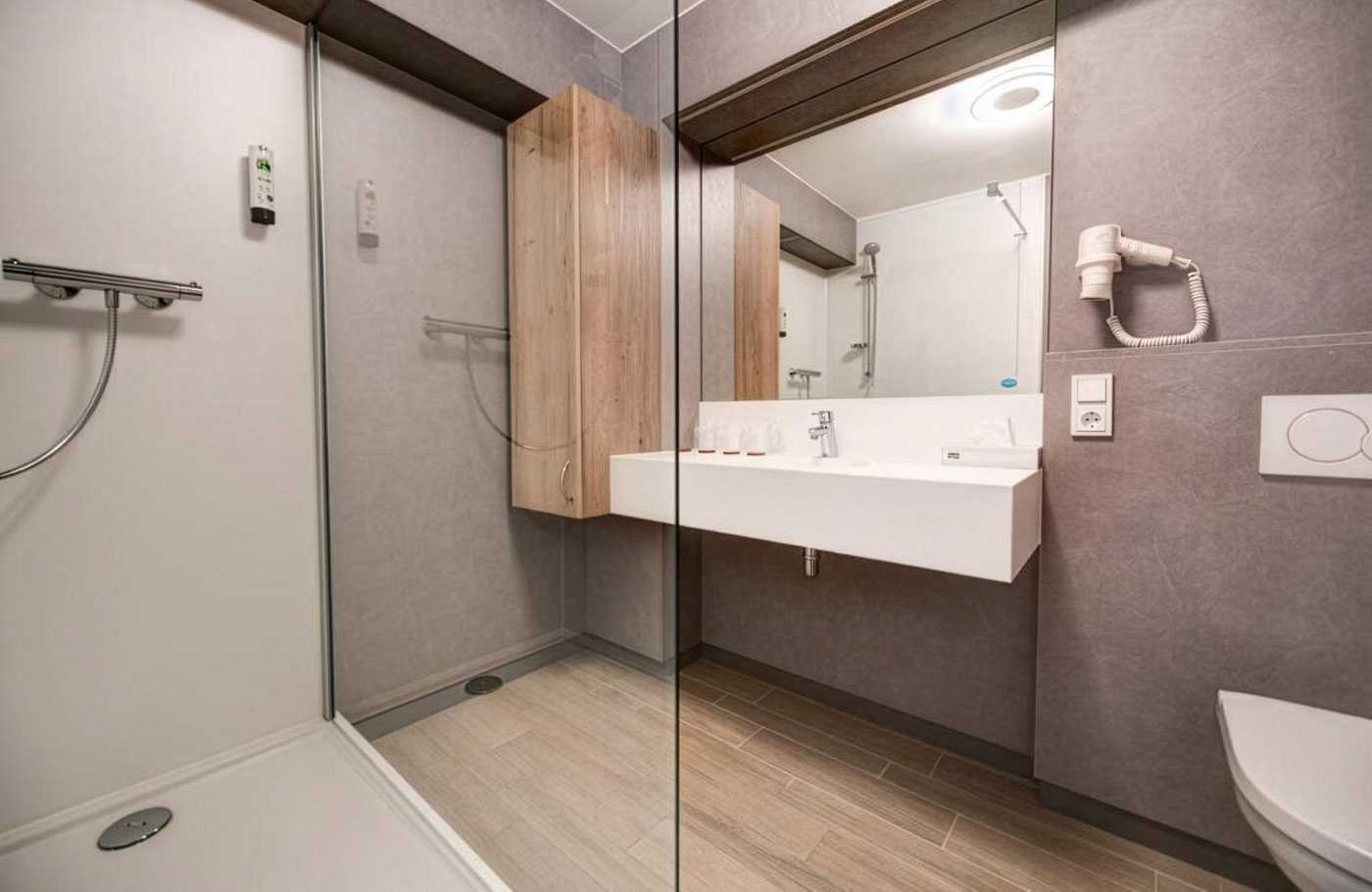 Kamer: Per lift bereikbaar; tv, badkamer; bad of douche, wc, föhn.