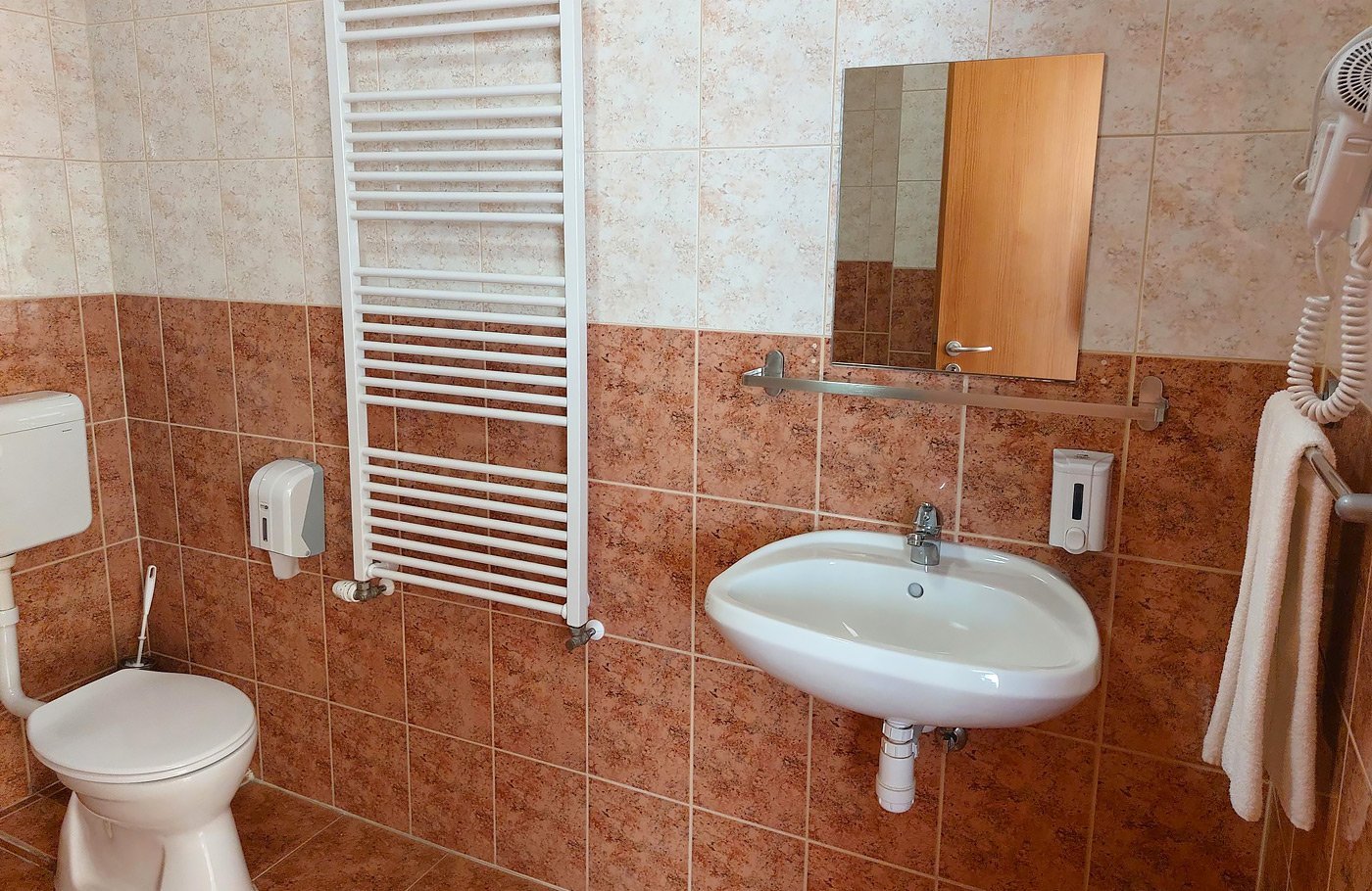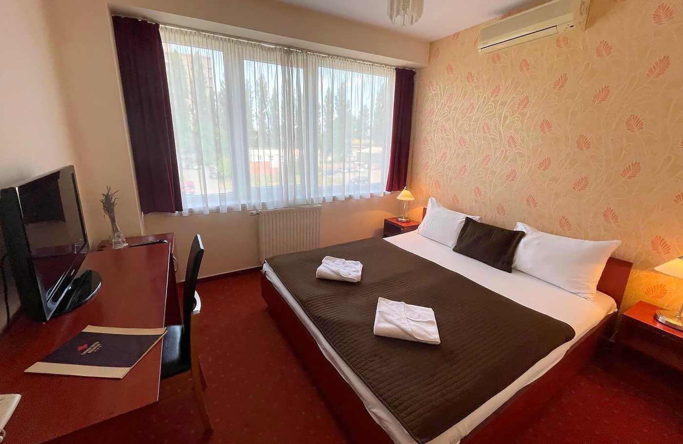 Kamer: Per lift bereikbaar; tv, airco, badkamer; bad of douche, wc, föhn.